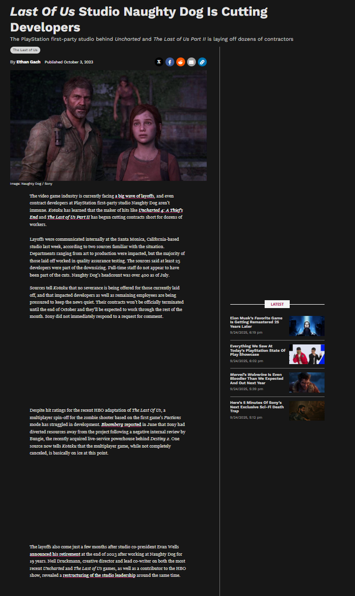 According to recent reports by Kotaku, Naughty Dog laid off dozens of contractors. The reports state that the QA team was heavily affected by the layoffs. The layoffs focused on contractors rather than full-time employees.