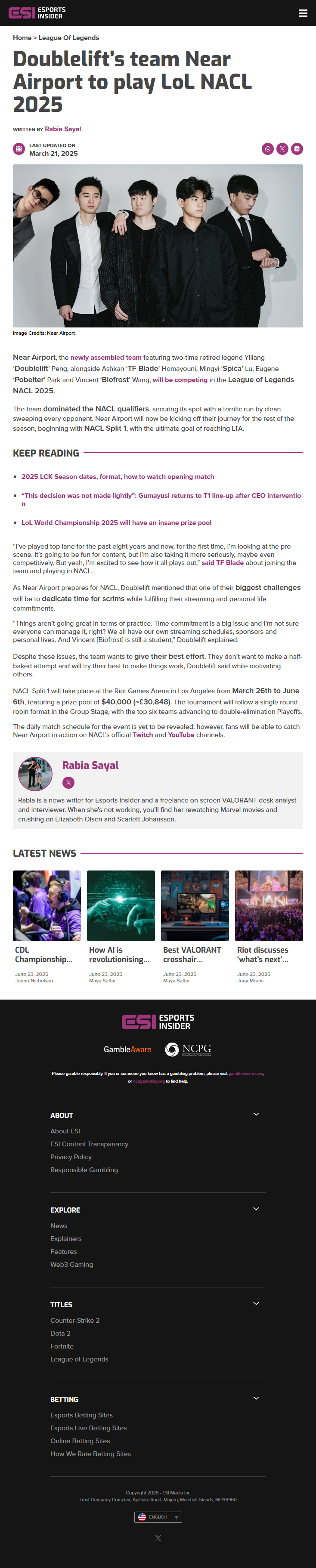 The newly formed Near Airport team, featuring two-time retired legend Yiliang ‘Doublelift’ Peng, along with Ashkan ‘TF Blade’ Homayouni, Mingyi ‘Spica’ Lu, Eugene ‘Pobelter’ Park, and Vincent ‘Biofrost’ Wang, is set to compete in the 2025 League of Legends NACL.