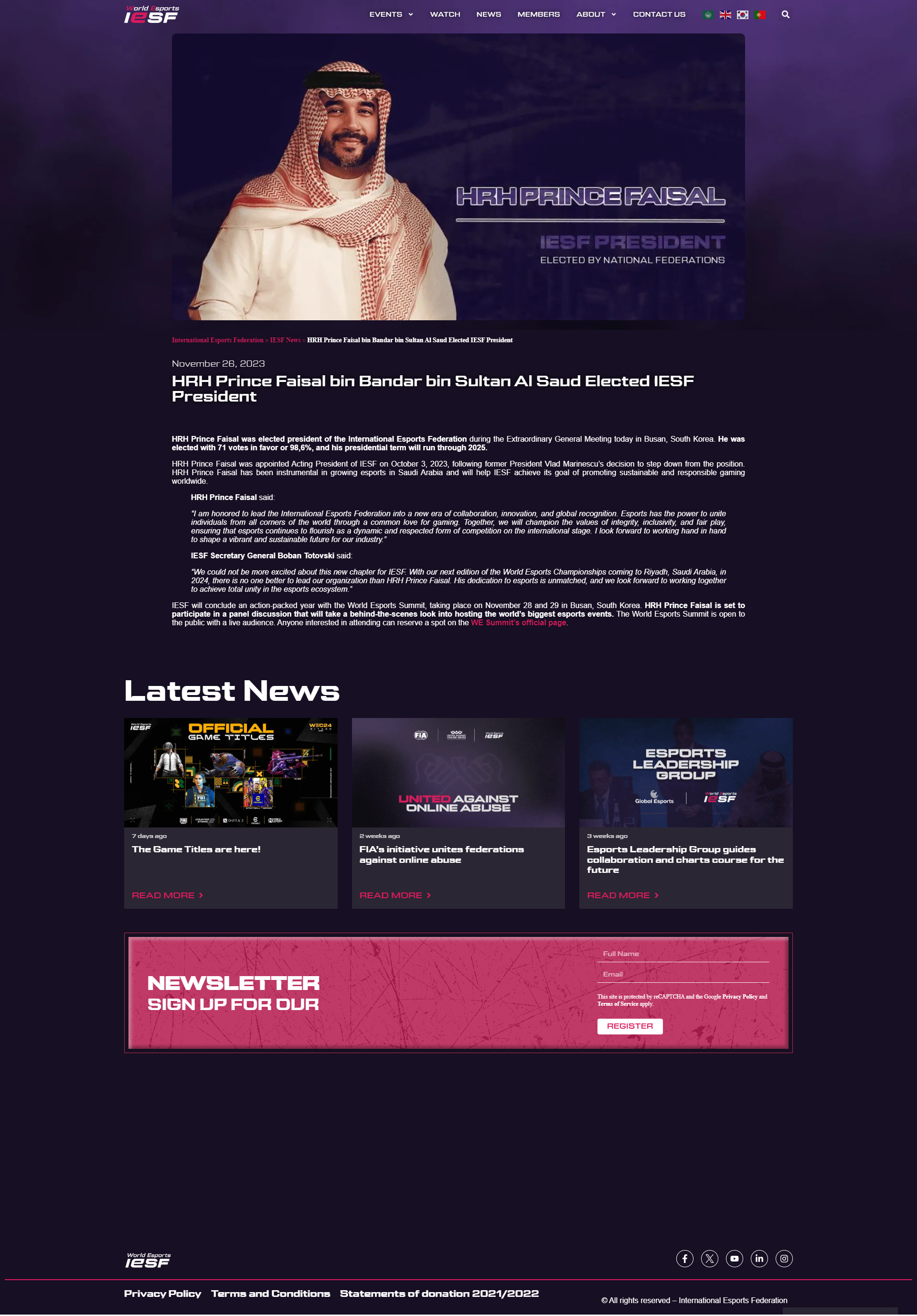 International Esports Federation revealed the new president of the federation. HRH Prince Faisal will lead the IESF. He was chosen as the new president at the Extraordinary General Meeting in Busan, South Korea. He was elected with 71 votes in favor or 98,6%, and his presidential term will run through 2025.