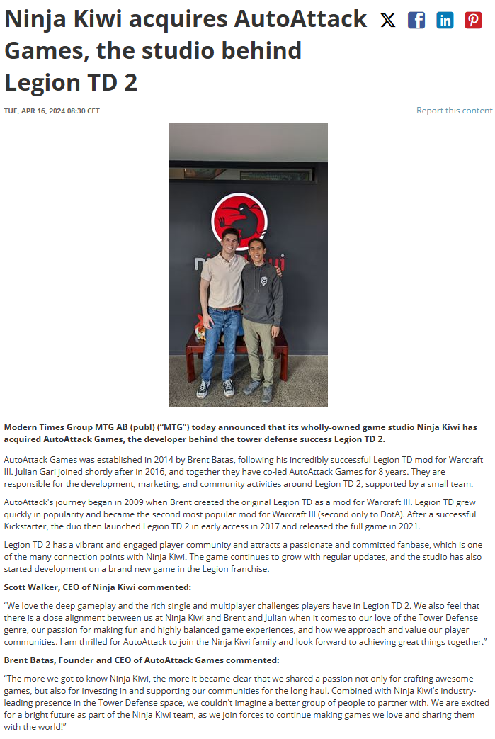 Brent Batas, Founder and CEO of AutoAttack Games stated “The more we got to know Ninja Kiwi, the more it became clear that we shared a passion not only for crafting awesome games, but also for investing in and supporting our communities for the long haul. Combined with Ninja Kiwi's industry-leading presence in the Tower Defense space, we couldn't imagine a better group of people to partner with. We are excited for a bright future as part of the Ninja Kiwi team, as we join forces to continue making games we love and sharing them with the world!”