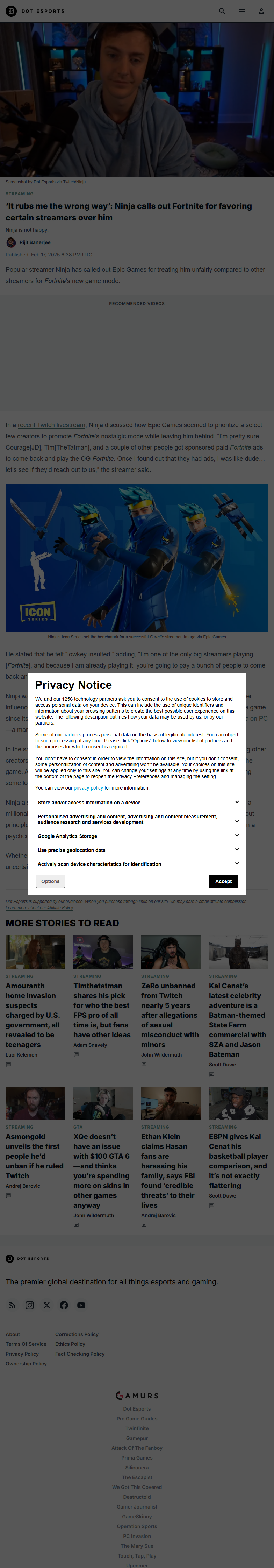 Popular streamer Ninja has criticized Epic Games for what he perceives as unfair treatment compared to other content creators in the promotion of Fortnite's nostalgic new game mode.