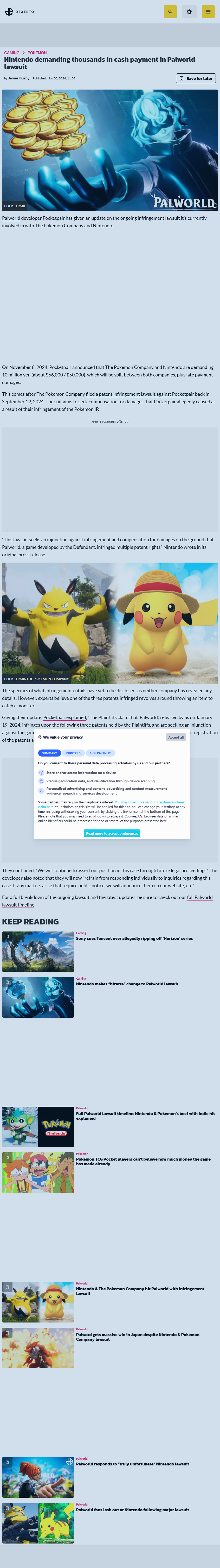 Pocketpair provided an update regarding the ongoing patent infringement lawsuit filed against them by The Pokémon Company and Nintendo. The companies are seeking 10 million yen (approximately $66,000 / £50,000) in damages, which will be split between them, as well as additional fees for late payment.