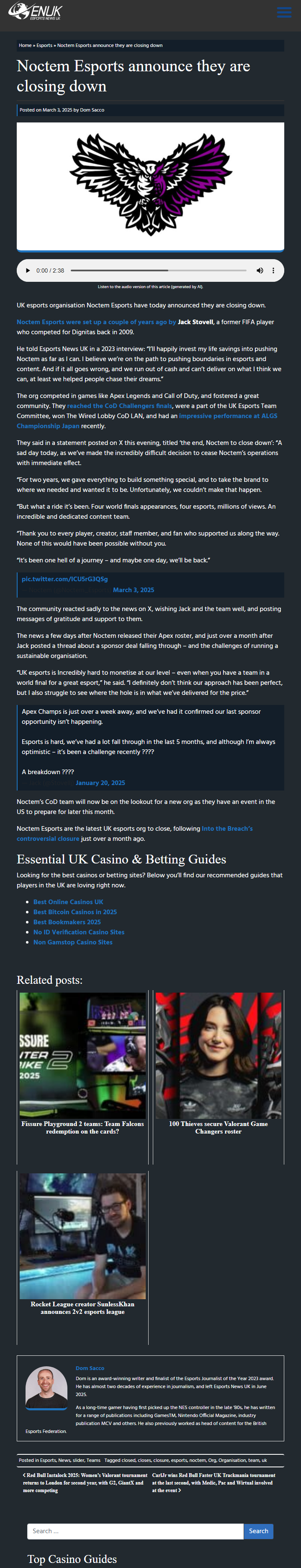 UK-based esports organization Noctem Esports has officially announced its closure, bringing an abrupt end to its two-year journey in the competitive gaming scene. The organization, which competed in Apex Legends and Call of Duty leagues, shared the news on March 3, 2025, via its official X account.