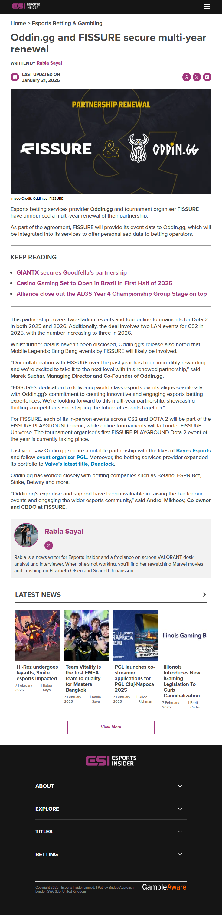 “Our collaboration with FISSURE over the past year has been incredibly rewarding and we’re excited to take it to the next level with this renewed partnership,” said Marek Suchar, Managing Director and Co-Founder of Oddin.gg.