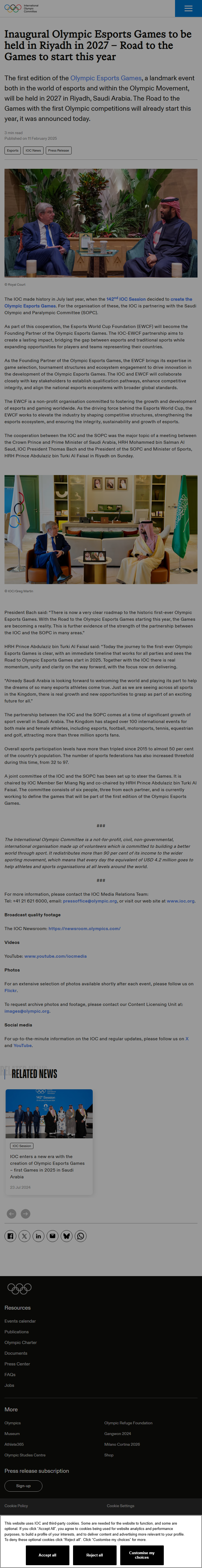 The first Olympic Esports Games are set to take place in Riyadh in 2027, two years later than initially planned, following a 12-year agreement signed with Saudi Arabia last year. The International Olympic Committee (IOC) announced that the kingdom's Esports World Cup Foundation will be the founding partner for the event.