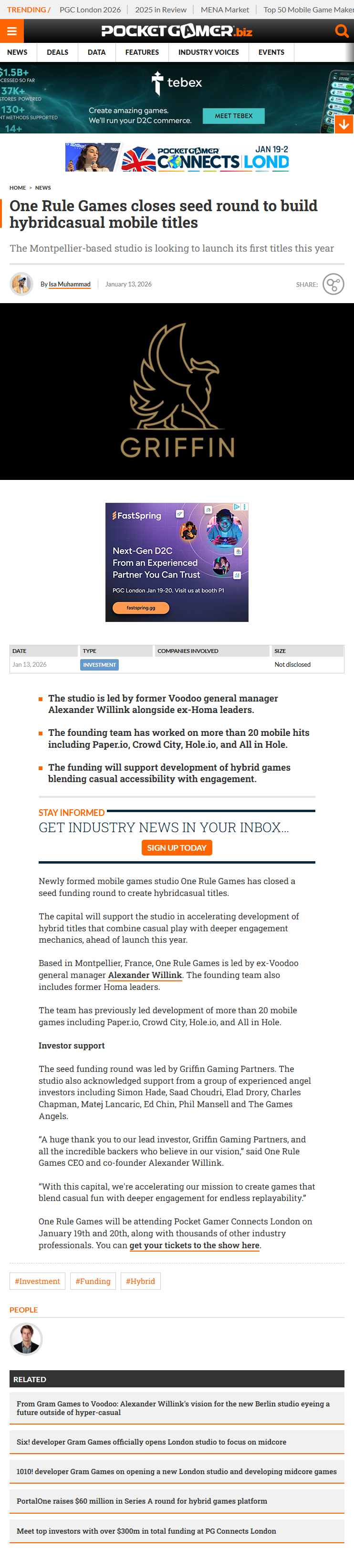 Mobile gaming studio One Rule Games has completed its seed funding round with backing from top investors to speed up work on hybrid-casual mobile games. The Montpellier-based team aims to launch its first titles later in 2026 blending easy-to-pick-up casual gameplay with mechanics that keep players coming back for more.