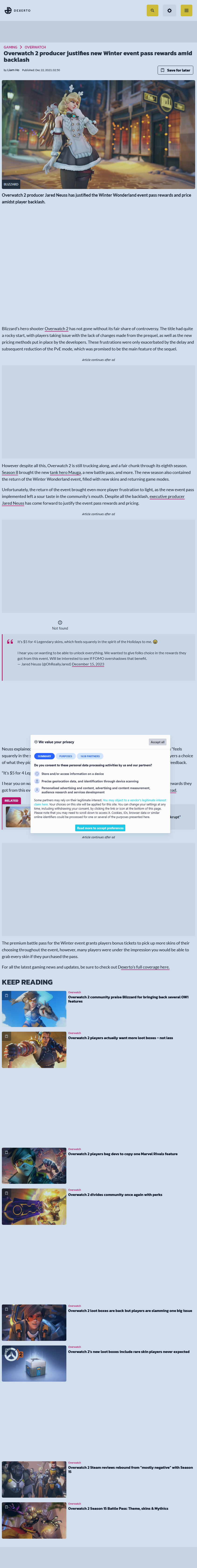 Overwatch 2 producer Jared Neuss defended the Winter Wonderland event pass rewards on Twitter. The rewards received a backlash from players as being "lazy" and "overpriced". Some players stated that the premium pass should have access to rewards. Overwatch 2 producer stated "It's $5 for 4 Legendary skins, which feels squarely in the spirit of the Holidays to me. I hear you on wanting to be able to unlock everything. We wanted to give folks choice in the rewards they got from this event. Will be interested to see if FOMO overshadows that benefit."