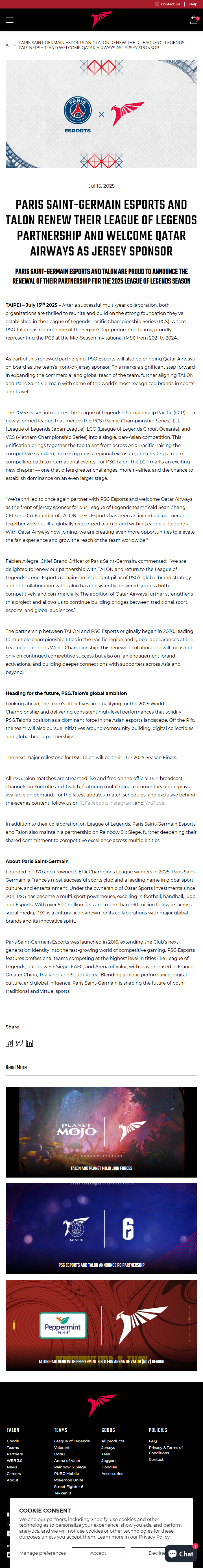 “We’re thrilled to once again partner with PSG Esports and welcome Qatar Airways as the front of jersey sponsor for our League of Legends team,” said Sean Zhang, CEO and Co-Founder of Talon Esports. “PSG Esports has been an incredible partner and together we've built a globally recognized team brand within League of Legends. With Qatar Airways now joining, we are creating even more opportunities to elevate the fan experience and grow the reach of the team worldwide.”