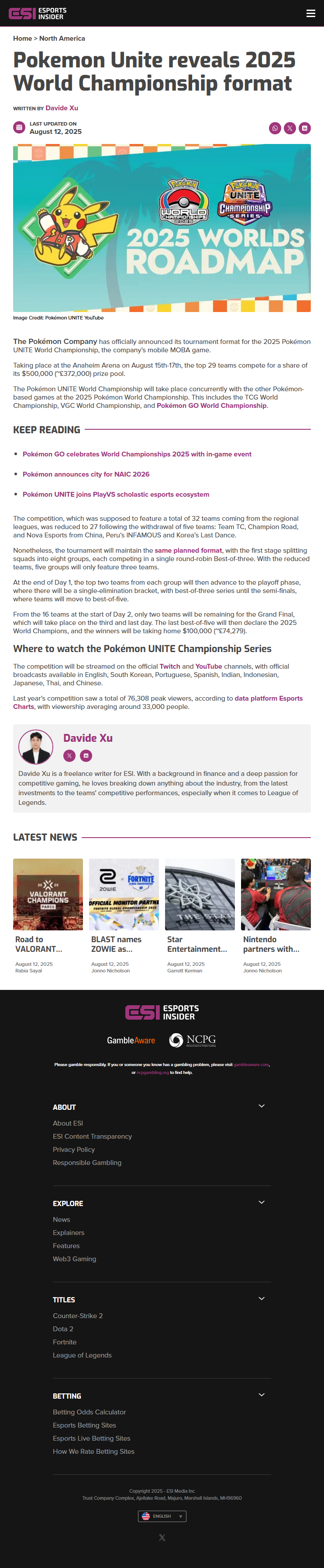 The Pokémon Company has outlined the official tournament structure for the 2025 Pokémon UNITE World Championship, set to take place from August 15th to 17th at Anaheim Arena in California.