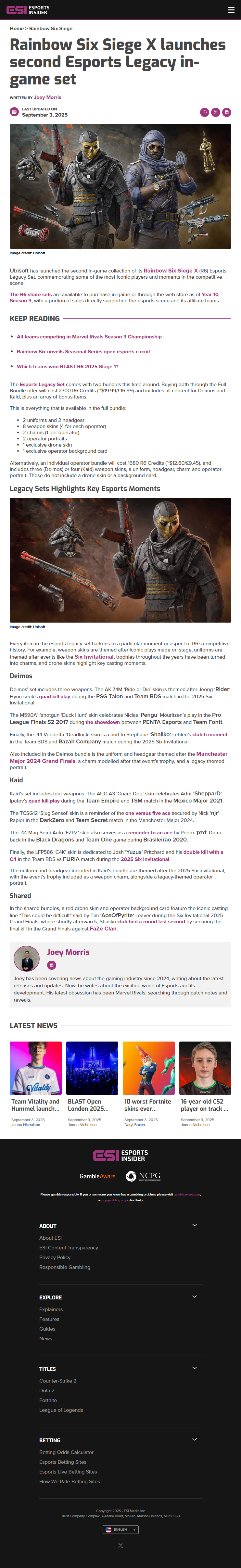 Available now both in-game and via the Rainbow Six web store, the latest Esports Legacy Set features two themed bundles—one for Deimos and one for Kaid. Players can opt to purchase the full collection for 2700 R6 Credits (approximately $19.99 / £16.99), which includes all exclusive cosmetics for both operators along with several bonus items.