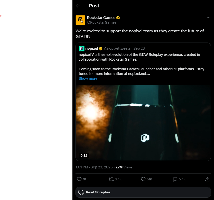 In a statement shared after NoPixel released a teaser trailer highlighting the collaboration, Rockstar said, “We’re excited to support the nopixel team as they create the future of GTA RP.”
