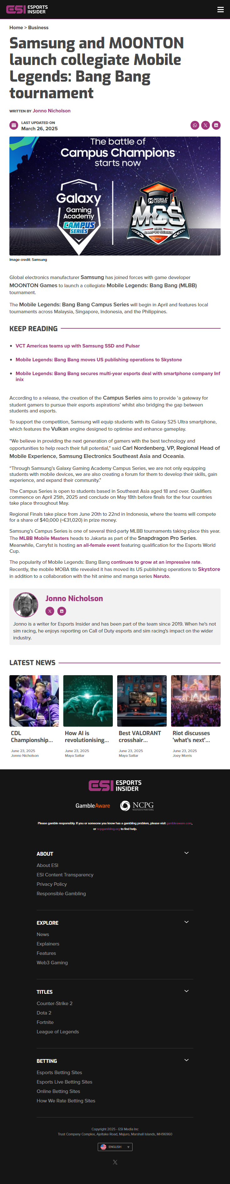 Samsung has partnered with game developer MOONTON Games to launch the Mobile Legends: Bang Bang Campus Series, a collegiate esports tournament set to take place across Southeast Asia. The competition, which begins in April 2025, will feature student teams from Malaysia, Singapore, Indonesia, and the Philippines.