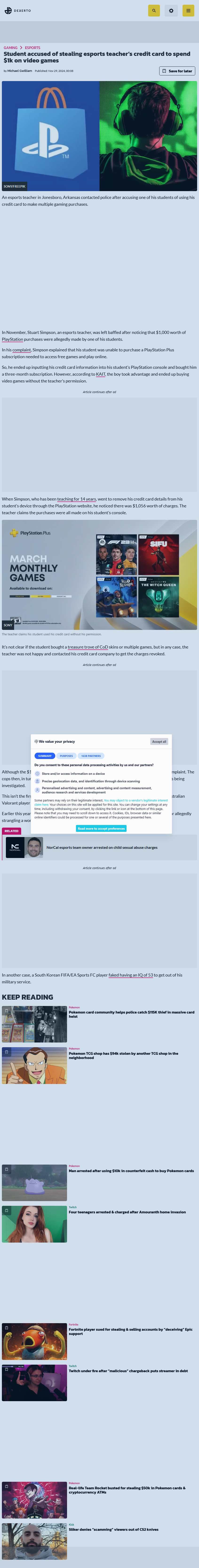 In November, Stuart Simpson, an esports teacher with 14 years of experience, became suspicious when he noticed over $1,000 in charges on his credit card related to PlayStation purchases. Simpson had initially entered his credit card details into a student’s PlayStation console to help the student buy a three-month PlayStation Plus subscription, which is required to access free games and play online. However, Simpson alleges that the student then took advantage of the situation by making additional purchases without permission.
