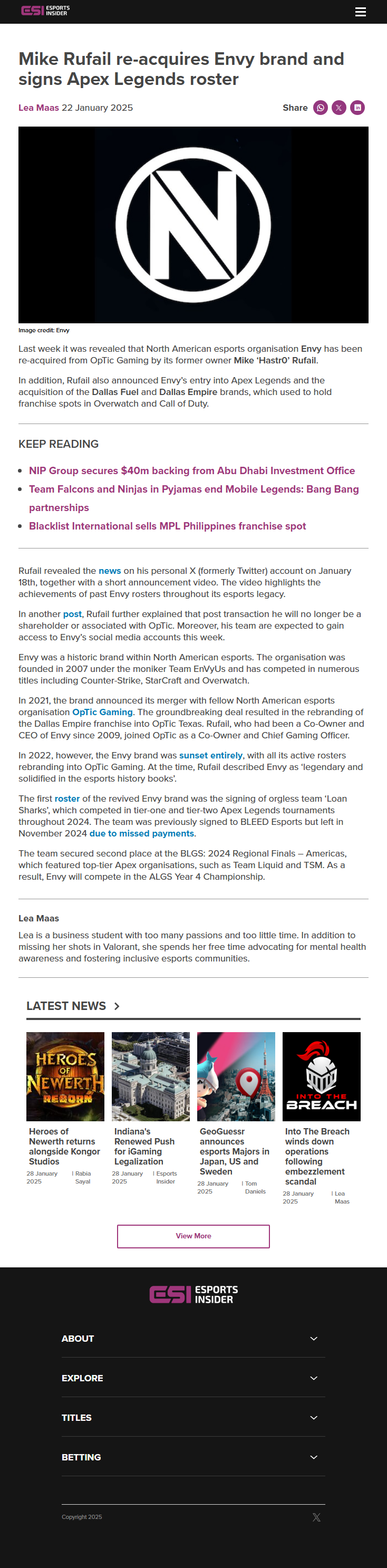 Envy, which was founded in 2007 as Team EnVyUs, has had a long history in North American esports, competing in games like Counter-Strike, StarCraft, and Overwatch. In 2021, Envy merged with OpTic Gaming, leading to the rebranding of the Dallas Empire into OpTic Texas. Rufail, who had been Co-Owner and CEO of Envy since 2009, also joined OpTic as Co-Owner and Chief Gaming Officer following the merger.