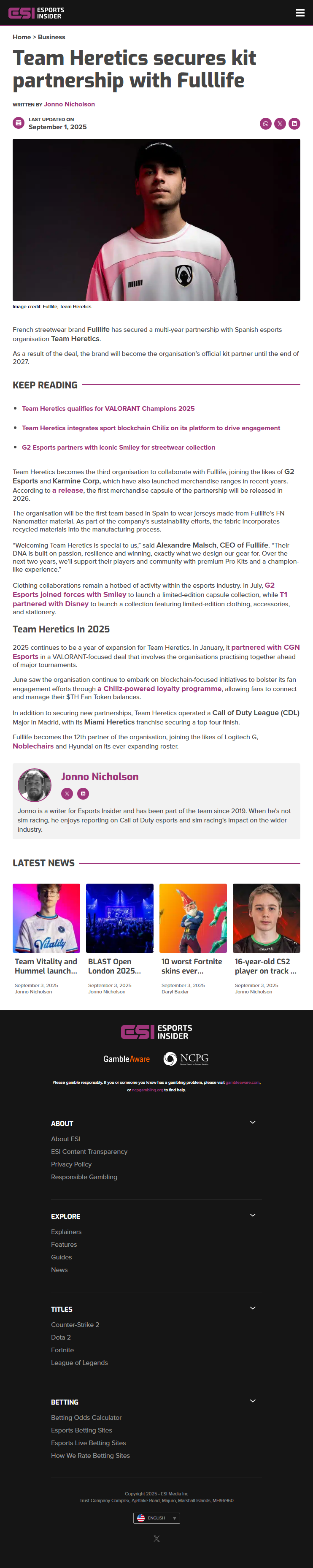 Spanish esports organization Team Heretics has signed a multi-year partnership with sustainable gaming apparel brand Fulllife, making the company its official kit partner until the end of 2027.