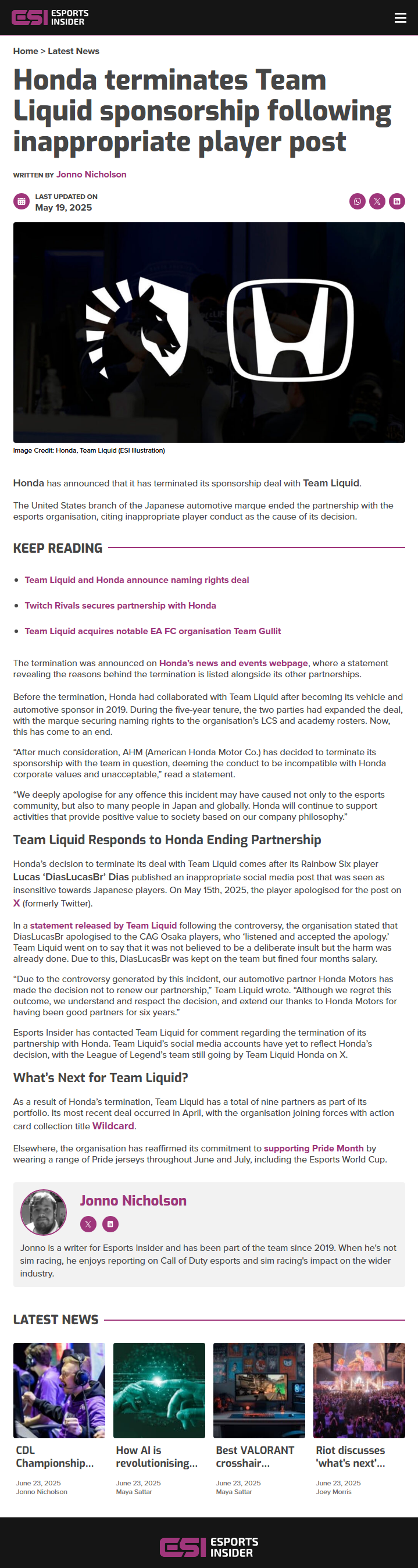 Honda has officially ended its long-standing partnership with Team Liquid, citing conduct by one of the esports organisation’s players that it deemed inconsistent with the company’s values. The decision was announced through American Honda Motor Co.'s (AHM) official news page, bringing an end to a sponsorship that had been in place since 2019.