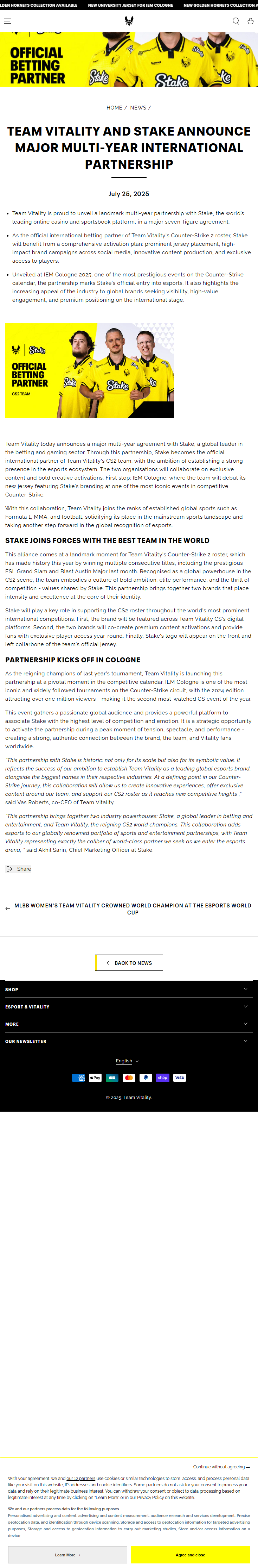 Team Vitality has entered a multi-year international partnership with betting and gaming company Stake, designating the firm as the official partner of its Counter-Strike 2 (CS2) team. The collaboration will debut at IEM Cologne, where Vitality will showcase a new jersey featuring Stake’s branding.