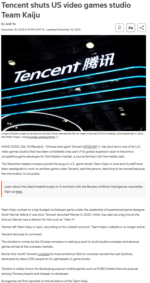 Chinese Tencent, has closed down US-based Studio Team Kaiju. According to reports, the decision to shut down Team Kaiju was made in June, and its personnel have since been reassigned to contribute to another game within Tencent. The company was led by Scott Warner, and had been working on a high-budget multiplayer game before the studio's closure. Reports state that Tencent did not release a statement regarding the closure.