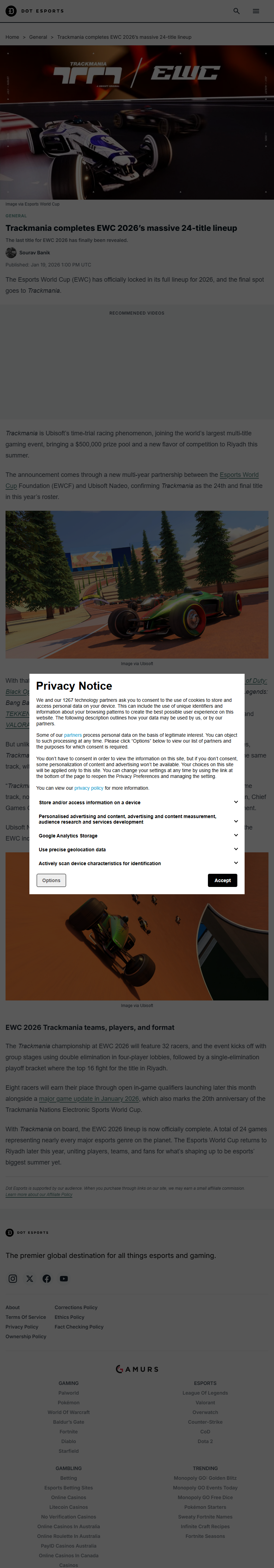 The Esports World Cup (EWC) just sealed its complete roster for 2026 by welcoming Trackmania as the 24th and final game. This Ubisoft title brings a fresh racing twist to the massive multi-game spectacle, complete with a hefty $500,000 prize pool.