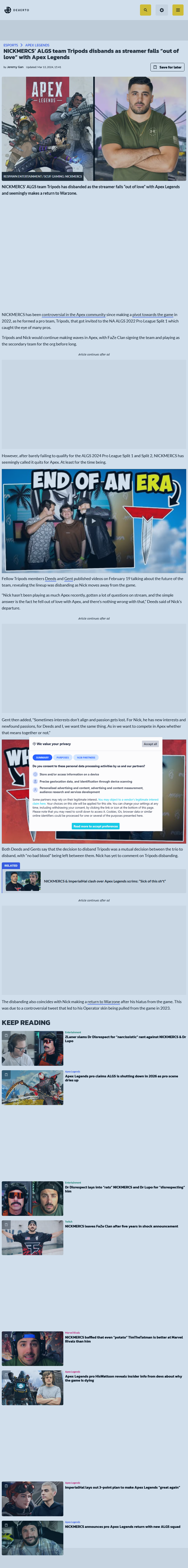 According to recent reports NICKMERCS’ Apex Legends team Tripods will disband. The Tripods trio, consisting of Gent, Deeds, and NickMercs, has decided to disband and will no longer compete together in the ALGS. This decision comes after just one of the four challenger circuit events in Split One. Gent and Deeds, along with their coach Voltic, will actively seek a new teammate to reform their team. However, all three members will also explore individual opportunities. NickMercs' future in competitive Apex Legends remains uncertain at this time.