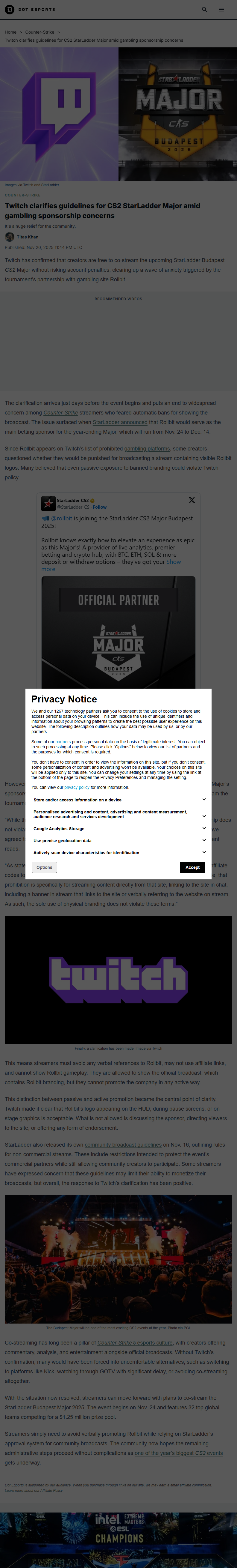 “While the StarLadder CS Major will be streamed on Twitch, the Rollbit event sponsorship does not violate our Community Guidelines or Terms of Service, as the event and sponsor have agreed to limit the sponsorship during the stream to physical branding only,” the platform stated.