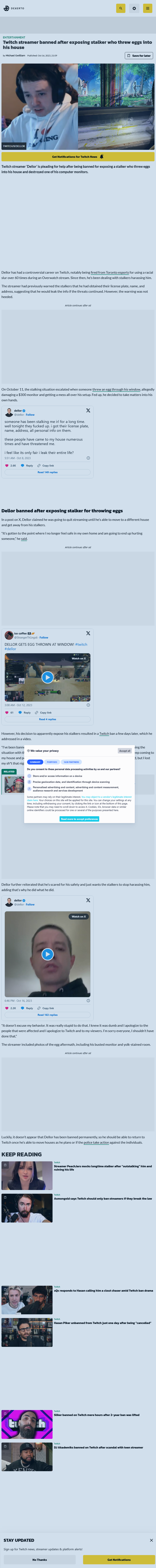 Twitch streamer "Dellor" was banned for exposing stalkers who threw eggs at his house. He stated that prior to exposing them he warned them that he had the stalker's license plate, name, and address. His warning did not produce any results and he was egged in his house once again. Dellor took the matter into his own hands and exposed the stalkers. Following the incident he was banned by Twitch.