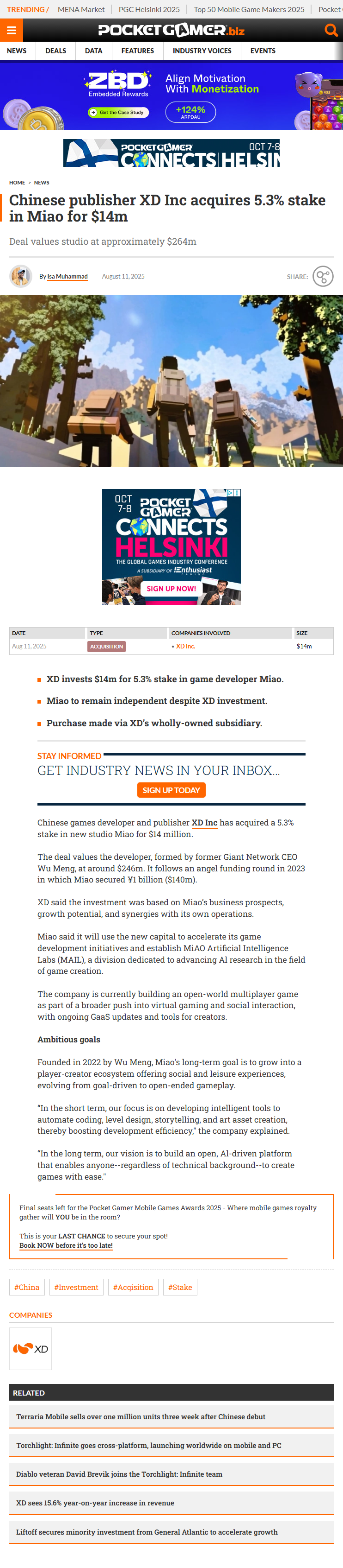 Chinese game developer and publisher XD Inc has made a strategic investment of $14 million in emerging game studio Miao, acquiring a 5.3% stake in the company. The transaction places Miao’s valuation at approximately $246 million, reflecting strong confidence in its long-term ambitions and innovation strategy.