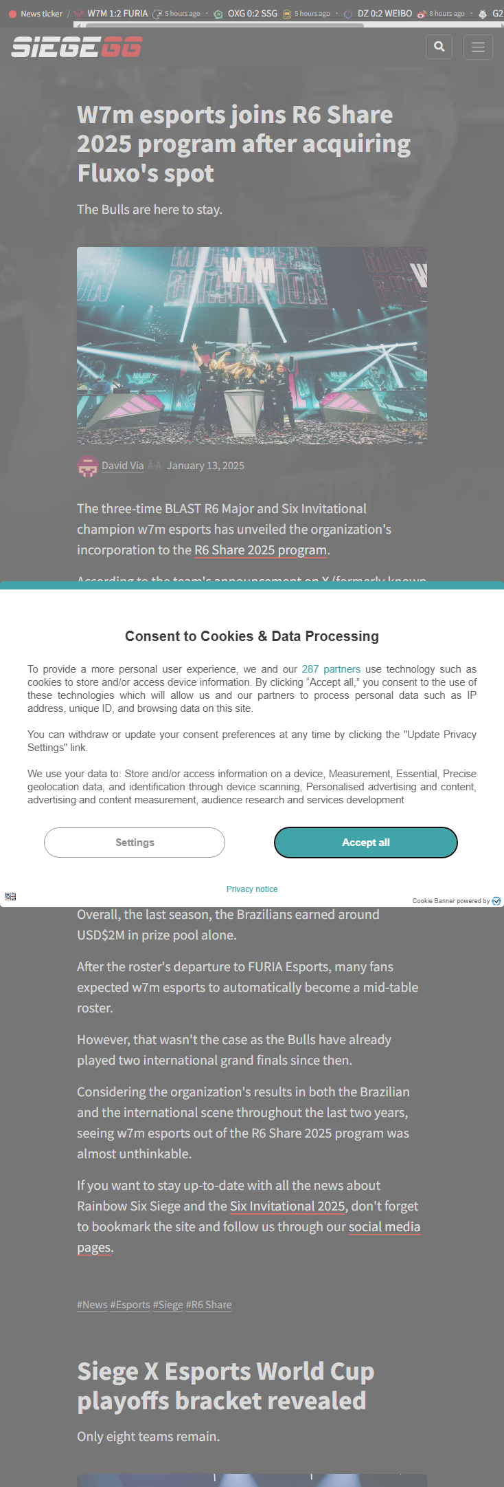 The Brazilian esports organization confirmed its participation on X (formerly Twitter), revealing that it secured a spot in the program by acquiring Fluxo's position. The R6 Share 2025 program was first introduced at the BLAST R6 Major in Montreal, where Ubisoft named eighteen of the twenty organizations set to join. While Fluxo was part of the original announcement, w7m esports was not initially included.