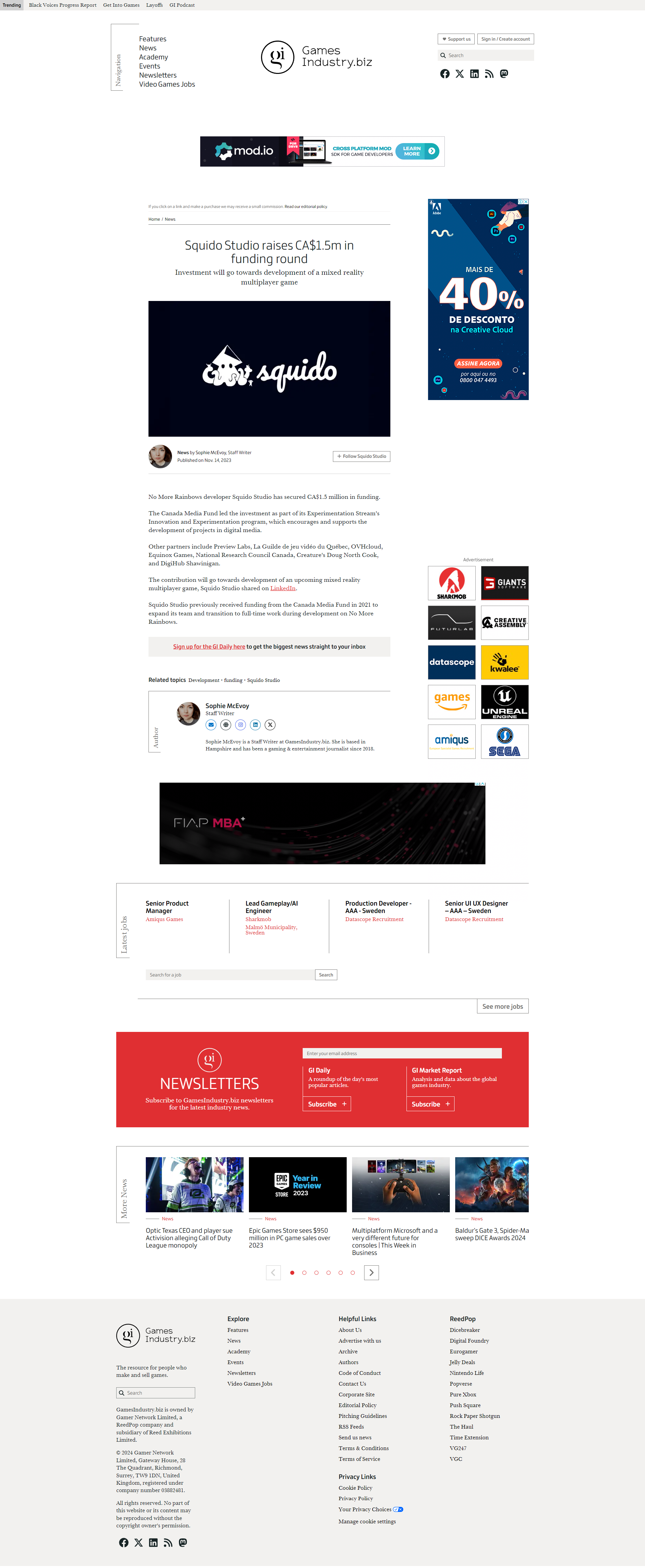 {{News |seo_title=Squido Studio Secures CA$1.5m |seo_keywords=Squido Studio |image=Screenshot 2023-11-14 223357.png |tags=Squido Studio |date=2023-11-14T13:08:31.000Z |sources={{NewsSource |source=Games Industry |url=https://www.gamesindustry.biz/squido-studio-raises-ca15m-in-funding-round |article=News/Squido Studio Secures CA$1.5m }} |author=Andura |category=Business |content=Squido Studio secured a CA$1.5m investment. The investment was made by the Canada Media Fund. Squido Studio is known for the critically acclaimed No More Rainbows title. The studio stated that the funding will be used to develop their next project. Squido Studio stated '''"A huge thank you to the entire team at Squido Studio for their dedication, passion, and hard work. And of course, a big thank you to YOU, our fans, who support and believe in us at every step of the way."''' }}
