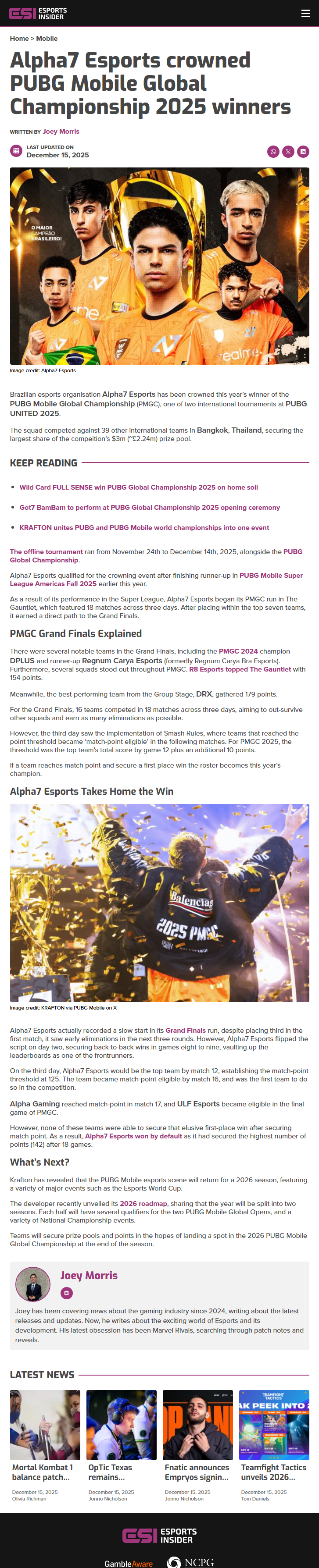 Brazilian esports team Alpha7 Esports has won the 2025 PUBG Mobile Global Championship, also known as PMGC. The tournament was one of two major international events held during PUBG UNITED 2025. The competition took place in Bangkok, Thailand, and featured 40 teams from around the world.