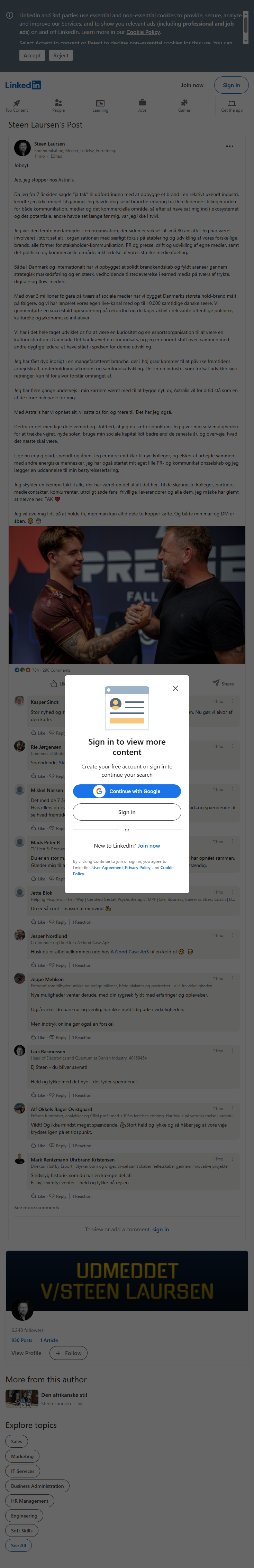 He stated "I'm stopping at Astralis. When I said yes 7 years ago to the challenge of building a brand in a relatively unknown industry, I didn't know much about gaming. However, I had solid industry experience from several senior positions in both communications, media and the commercial area, so after familiarizing myself with the ecosystem and the potential that others had seen long before me, I had no doubts. I was the fifth employee in an organization that has since grown to just under 80 employees. I have been involved in virtually everything in the organization with particular focus on the establishment and development of our various brands, all forms of stakeholder communication, PR and press, operation and development of own media, as well as the political and commercial area, including management of our strong media department. Both in Denmark and internationally, we have built solid brand awareness and filled arenas through strategic marketing and a strong, persistent presence in earned media across print, digital and flow media. With over 3 million followers across social media, we have built Denmark's largest team brand measured by followers, and we have launched our own live channel with up to 10,000 simultaneous Danish viewers."