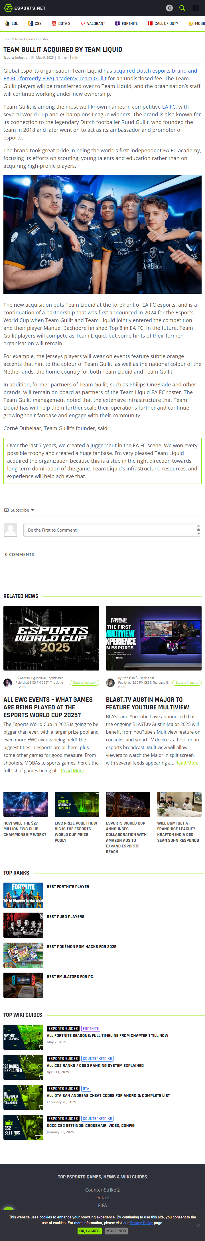 The acquisition follows the two organizations' collaboration during last year’s Esports World Cup, where Team Gullit player Manuel Bachoore reached the Top 8 in the EA FC competition. His performance helped Team Liquid secure a second-place finish in the Club Championship and earn $4 million (~£3 million) in prize money.