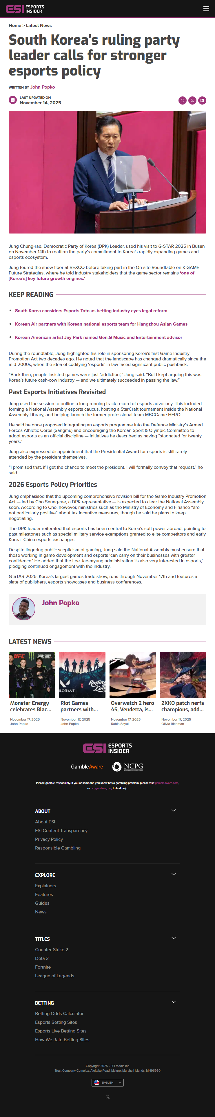 Jung Chung-rae, leader of the Democratic Party of Korea (DPK), visited G-STAR 2025 in Busan on November 14th, reaffirming his party's commitment to the country’s expanding gaming and esports sectors. Speaking at the On-site Roundtable on K-GAME Future Strategies, Jung highlighted gaming as a key growth engine for Korea’s future.