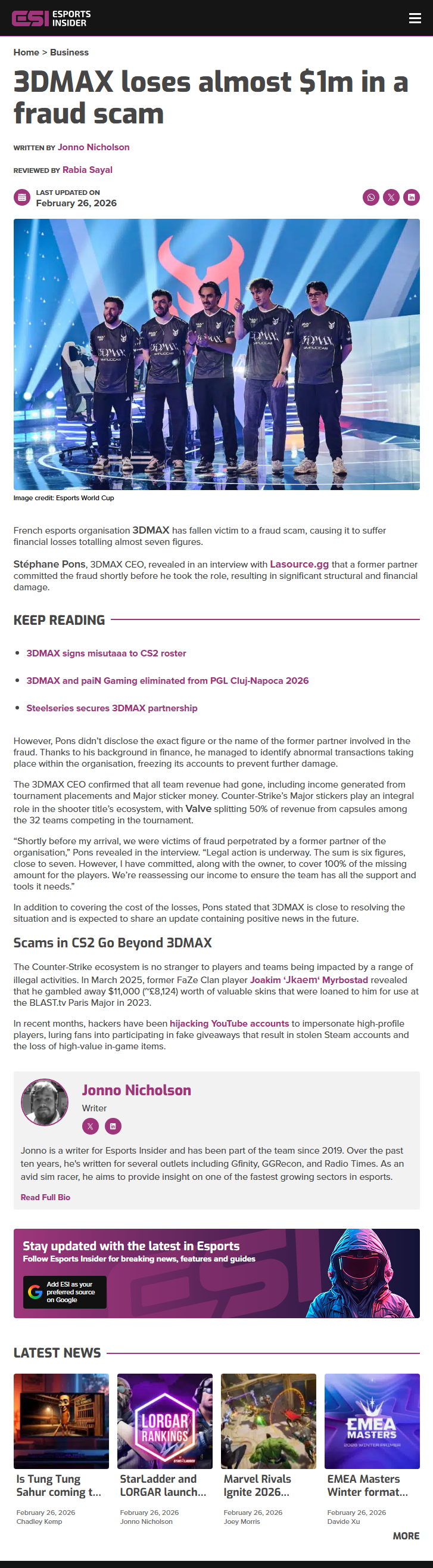 - French esports organisation 3DMAX has been defrauded of a sum described as "six figures, close to seven" by a former partner, with CEO Stéphane Pons confirming the fraud occurred shortly before he joined the organisation and wiped out all team revenue including Major sticker money.